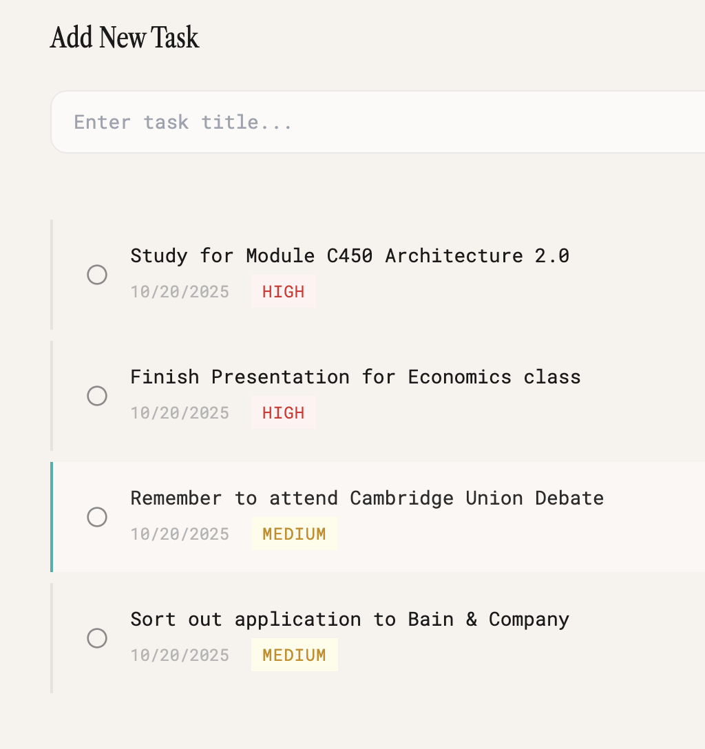 Create tasks with priority levels (low, medium, high). Set due dates and track completion. See your progress at a glance. No complicated project management—just simple, effective task tracking.